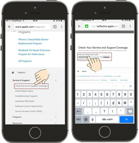 Bước 3: Sau khi đã vào Support bạn kéo xuống dưới và chọn vào dòng Check Service & Support Coverage lúc này giao diện sẽ hiện ra 1 ô trống Enter your hardware seial number bạn nhập 15 số imei mà bạn đã kiểm tra ở bước 1 vào rồi nhấn Continue.