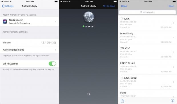 Trên iOS chúng ta cũng có thể dùng ứng dụng Airport Utility chính hãng Apple để làm tương tự. Tải về app này từ AppStore, Sau đó chúng ta vào Cài đặt > Airport Utility > bật Wifi Scanner lên. Sau đó vào lại ứng dụng vừa tải và bấm vào nút Wifi Scan ở góc trên bên phải ứng dụng, ứng dụng sẽ quét và cho chúng ta biết kênh của các điểm wifi xung quanh, chúng ta chỉ cần để ý kênh nào được dùng nhiều nhất và đổi lại thành các kênh ít bị trùng ( ưu tiên 1, 6, 11).