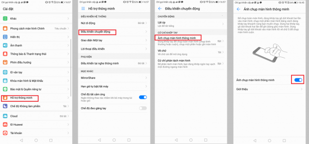 Từ màn hình chính chọn Cài đặt > Hỗ trợ thông minh > Điều khiển chuyển động > Ảnh chụp màn hình thông minh sau đó kích hoạt công tắc.