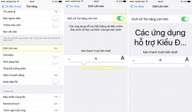 Tại menu trợ năng bạn chọn 'Chữ lớn hơn' và bật tính năng này lên, đồng thời kéo thanh trượt chỉnh cỡ chữ từ trái sang phải sao cho phù hợp với thị lực của mình.