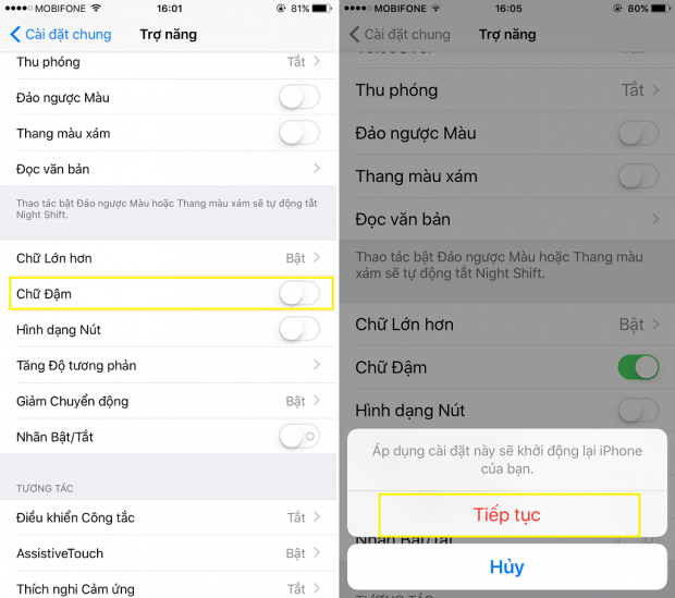Ngoài ra, bạn cũng có thể làm đậm chữ bằng cách bật tính này tại menu trợ năng, khi bật tính năng này iPhone của bạn sẽ khởi động lại, mất khoảng 1 phút.