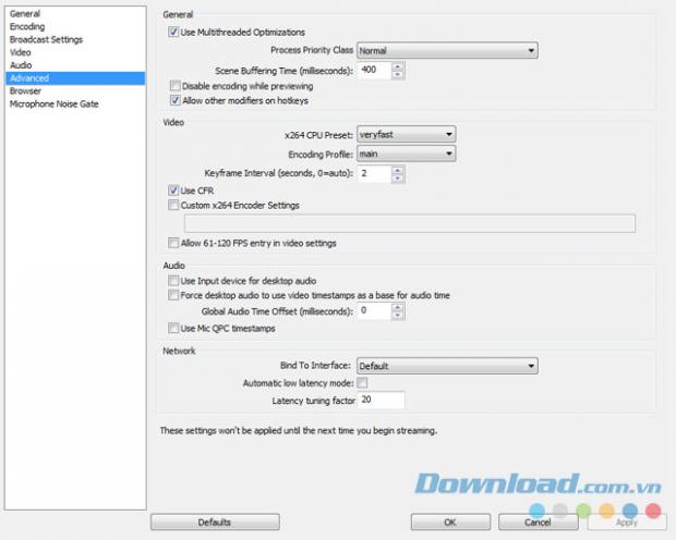 Bên cạnh đó, bạn còn có thể quay hình và ghi âm lại những tệp media trên Internet và lưu về máy tính của mình. Hiện tại Open Broadcaster Software đã được viết lại hoàn toàn mới với tên gọi là OBS Studio, có sẵn các tính năng của bản Open Broadcaster Software gốc và hỗ trợ nhiều tính năng tiên tiến hơn như nhiều đầu ra, xem trước khi stream, hỗ trợ nhiều nền tảng. Trong khuôn khổ bài viết này, chúng ta sẽ cùng tìm hiểu cách thiết lập các tùy chọn âm thanh, hình ảnh, video... trong phần mềm Open Broadcaster Software. Cách thực hiện cũng được áp dụng tương tự trong OBS Studio mới.