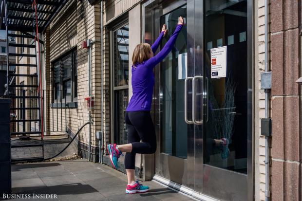 12. Động tác cuối cùng tốt nhất là bạn nên dựa vào tường để đảm bảo thăng bằng. Vẫn dựa vào dải băng nhưng thay vì di chuyển sang ngang thì bạn sẽ đưa chân lên/xuống tại chỗ. Hãy bắt đầu với 5 nhịp, sau đó đổi chân và tăng lên 10 nhịp cho lần tập tiếp theo.