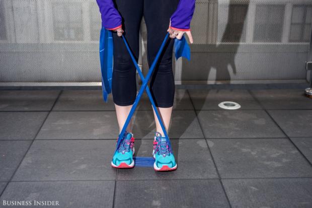 11. Động tác này yêu cầu phải có một dải băng đàn hồi và đứng thẳng. Sau đó, đặt chân lên dải băng, kéo cho đến khi dây căng và bước sang phải 5 bước, tiếp tục bước sang trái 5 bước. Bạn có thể luyện tập nhiều hơn với mỗi bên 10 bước.