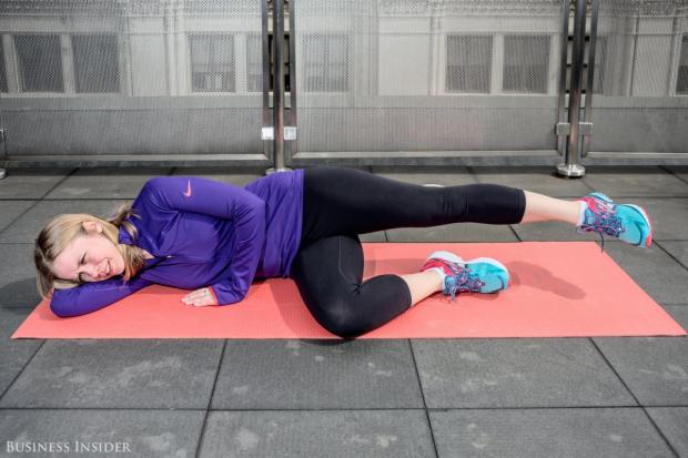 6. Đối với các động tác tiếp theo, bạn cần phải chuyển trọng tâm sang một bên với một chân gập lại và kê đầu lên một cánh tay. Giơ chân còn lại lên trong vòng 10 giây và tăng dần lên 30 giây cho những lần tập sau.