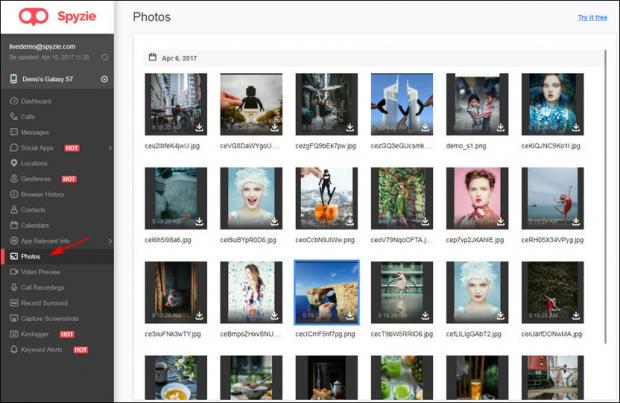 Spyzie cho phép bạn xem tất cả hình ảnh, bao gồm ảnh chụp từ camera, ảnh chụp màn hình và cả những hình ảnh đã được tải xuống thiết bị mục tiêu. Ảnh từ thiết bị mục tiêu được hiển thị dưới dạng hình thu nhỏ, nhưng bạn cũng có thể tải xuống ảnh gốc trong máy.