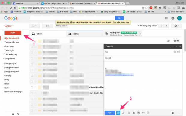 Bước 3: Truy cập vào Gmail và chọn “Soạn” để tạo thư mới. Lúc này chúng ta sẽ thấy bên cạnh nút “Gửi” sẽ có thêm icon của “Mail2Cloud”