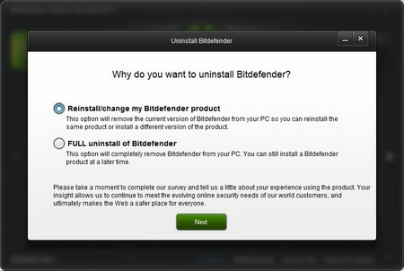 Sau đó chọn tiếp tùy chọn 'Reinstall/change my Bitdefender product” ở hộp thoại hiện ra tiếp theo rồi nhấn Next để tiếp tục.