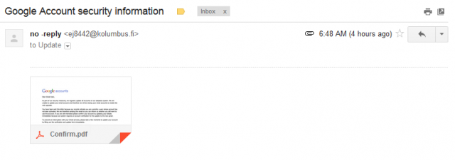 Và khi mở file .pdf này ra, nội dung file chủ yếu là dọa dẫm người sử dụng cần phải update tài khoản nếu muốn tiếp tục dùng. Và người gửi cũng không yêu cầu người nhận cần phải update bằng cách bấm vào đường link đính kèm. Tuy nhiên, với những cảnh báo đi kèm, người dùng rất dễ bấm vào đường link này.