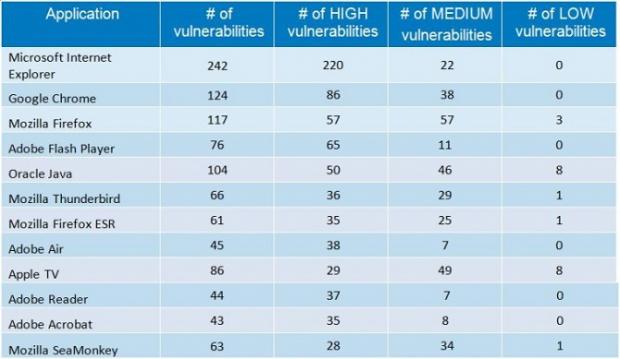 Về phía các ứng dụng phổ biến, Internet Explorer của Microsoft đứng đầu bảng danh sách với 242 lỗ hổng được phát hiện trong đó có tới 220 lỗ hổng được đánh giá ở mức độ nghiêm trọng cao. Xếp thứ 2 là trình duyệt Chrome với 124 lỗ hổng bảo mật, vị trí tiếp theo thuộc về Mozilla Firefox với 117 lỗ hổng được phát hiện.