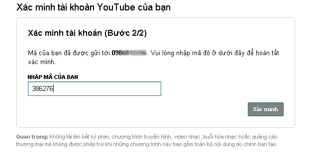 Sau khi bạn điền đầy đủ thông tin 'Quốc gia' và 'Số điện thoại cần xác minh' Youtube sẽ cung cấp một đoạn CODE cho bạn qua điện thoại hãy ghi nhớ đoạn mã đó.