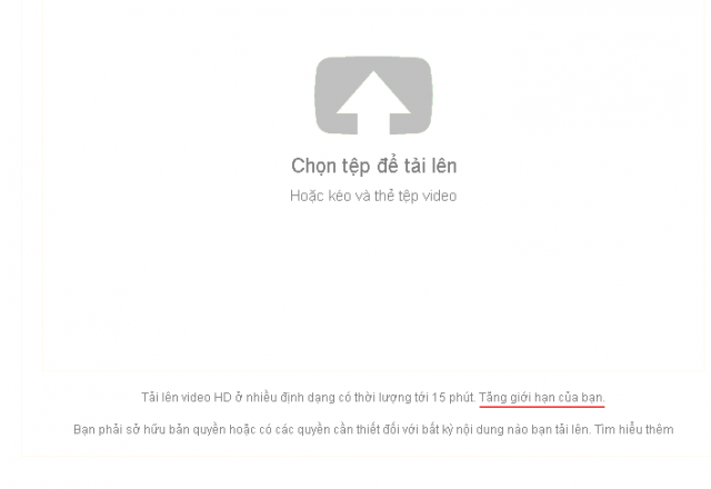 Sau khi chuyển tới trang 'Chọn đệp tải lên' bạn để ý ở dưới cùng sẽ có thông báo 'Tải lên video HD ở nhiều định dạng có thời lượng tới 15 phút. Tăng giới hạn của bạn'. Click vào đường dẫn được bôi đỏ.