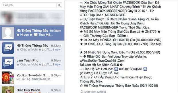 Hình thức này ở Việt Nam xuất hiện rất nhiều và hiện nay đang lan rộng ra trên cả những thiết bị smartphone. Thông thường người dùng sẽ nhận được một tin nhắn từ một số lạ yêu cầu bạn cung cấp thông tin cá nhân, số điện thoại, địa chỉ...để có thể xác nhận trúng thưởng trong một chương trình mà bạn chưa hề tham gia trước đó.