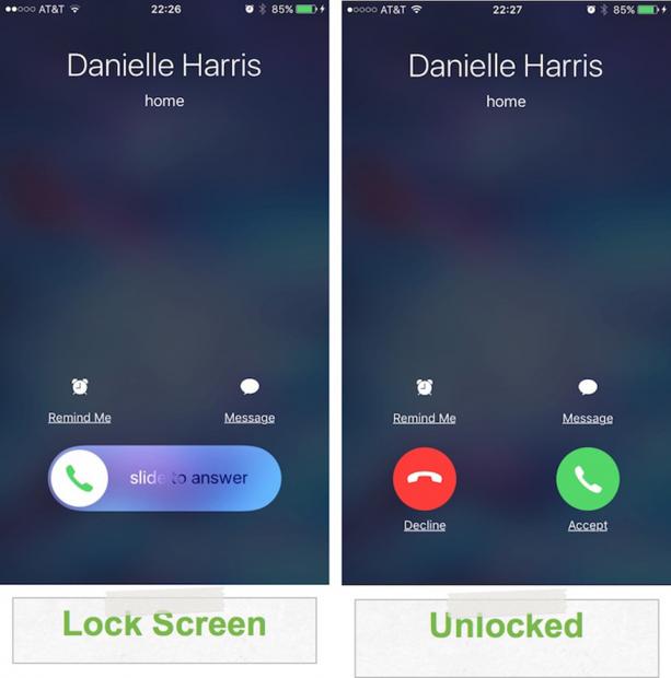 Có hai giao diện khác nhau khi bạn cần để nhận một cuộc gọi điện thoại. Các tùy chọn này xuất hiện trên màn hình khóa và khi điện thoại của bạn được mở khóa. Nếu bạn nhận được một cuộc gọi trong khi trên màn hình khóa, 'slide to unlock' sẽ xuất hiện tùy chọn biến thành 'trượt để trả lời'. Điều này giúp cho iPhone của bạn không vô tình từ chối cuộc gọi khi điện thoại đang ở trong túi. Khi điện thoại của bạn đã được mở khóa, bạn sẽ nhận được một màn hình có hai nút là 'Từ chối và chấp nhận'. .