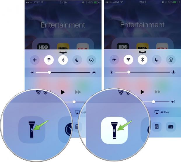 Có thể việc bật tắt đèn pin trên iPhone rất đơn giản với một vài thao tác truy cập vào trung tâm kiểm soát. Tuy nhiên chắc chắn bạn sẽ không biết rằng những công tắc nhở (phần zoom lên trong hình) sẽ thay đổi như đèn pin thật khi các bạn bật/tắt tính năng này.