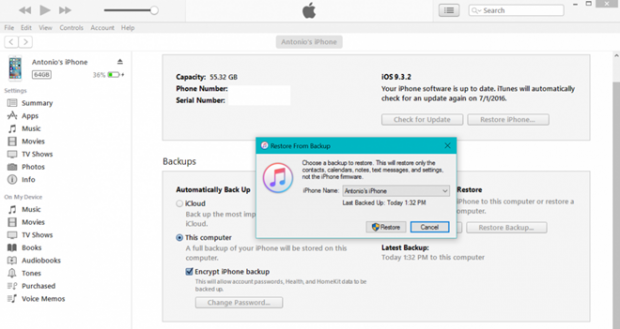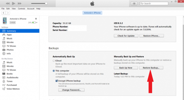 Bước 6: Bạn hãy chọn đúng bản backup mà mình vừa tạo ra rồi tích Restore. Trong phần này bạn phải nhập đúng mật khẩu “Encrypt iPhone Backup” để iPhone tự khôi phục dữ liệu.