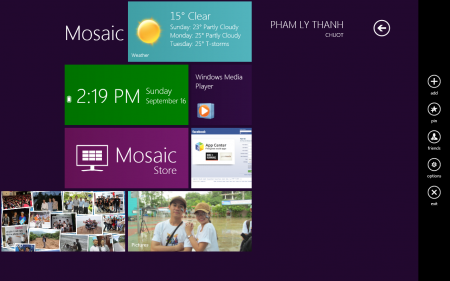 Các công cụ đã cài đặt ở trên sẽ giúp Windows XP/Vista/7 có thêm nhiều thành phần vốn chỉ có trên Windows 8. Để bổ sung thêm giao diện Modern UI (trước đây gọi là Metro) vào Windows, bạn cần tải về sử dụng phần mềm Mosaic (dung lượng: 572 KB). Tại đây, bạn cũng dễ dàng tải về nhiều thành phần bổ sung để gắn lên không gian Modern UI cho thật lộng lẫy, như: Video (phim), Pictures (hình ảnh), Weather (thông tin thời tiết), Today (thông tin ngày hiện tại)… Sau khi tải được một thành phần bổ sung về, bạn giải nén sẽ thu được một thư mục, rồi chép nó vào thư mục Widgets trong thư mục đã giải nén phần mềm Mosaic.