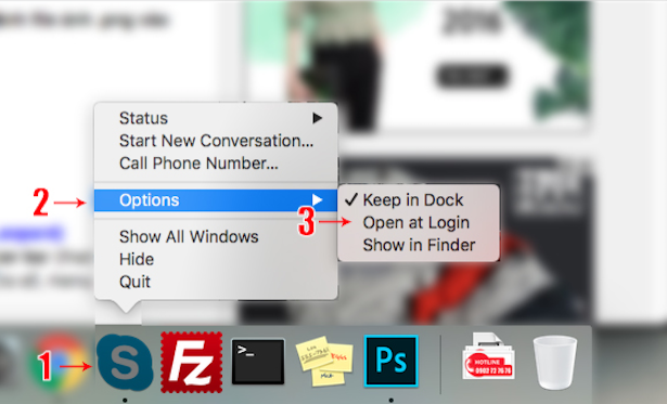 Nếu ứng dụng mà bạn dự định cho chạy tự động đang nằm trên thanh dock của Mac OS X, hãy nhấn chuột phải lên biểu tượng của ứng dụng đó (hay giữ phím Control và nhấn lên biểu tượng). Chọn Options và sau đó chọn Open at Login.