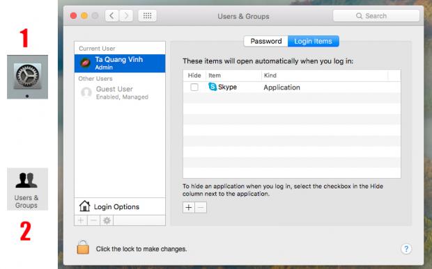 Bạn hãy tìm tên của người dùng hay nhóm người dùng cần thiết lập ở danh sách bên trái, chọn thẻ Login Items ở phía trên. Màn hình sẽ hiển thị danh sách các ứng dụng tự chạy khi bạn đăng nhập vào hệ thống.