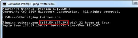 Trước tiên, chúng ta cần biết địa chỉ IP trang Twitter. Tìm địa chỉ bằng câu lệnh ping trong cửa sổ lệnh (nhấn Start, gõ Command Prompt và nhấn Enter). Gõ ping twitter.com vào cửa sổ lệnh để xem địa chỉ IP của trang.