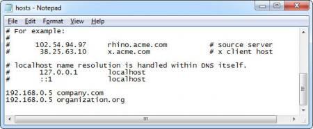 Ví dụ như, nếu có một web server với địa chỉ IP cục bộ 192.168.0.5 dùng cho cả company.com và organization.org, bổ sung dòng sau đây vào file hosts trên máy tính: