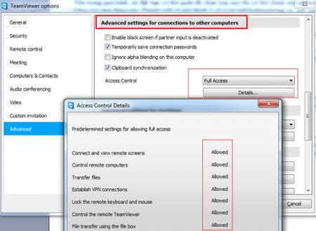 Và theo mặc định khi ai đó truy cập máy tính của bạn thông qua Teamviewer thì người đó có được toàn quyền kiểm soát máy tính của bạn. Nghĩa là với quyền truy cập đầy đủ người ta có thể kết nối và xem màn hình của bạn, kiểm soát màn hình, chuyển tập tin, thiết lập kết nối VPN… và có thể kiểm soát Teamviewer của bạn.