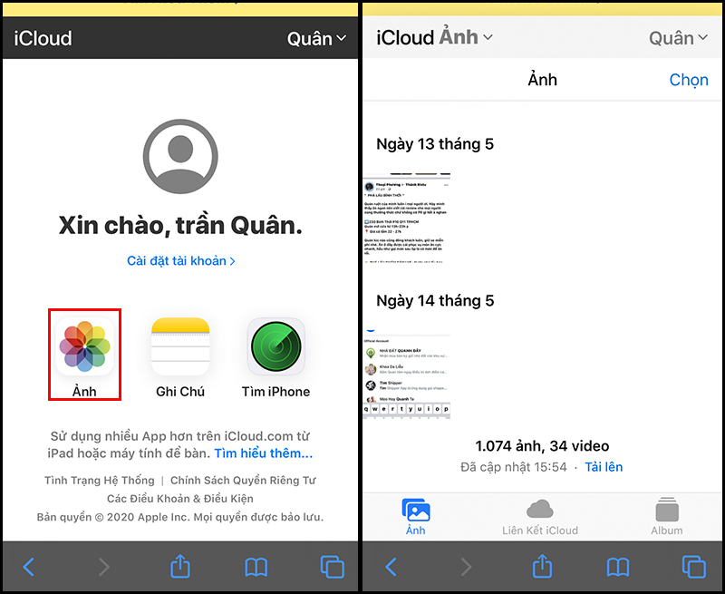 Sau khi đăng nhập iCloud thành công > Bạn chọn vào Ảnh để có thể xem được ảnh đã sao lưu trên iCloud của bạn.