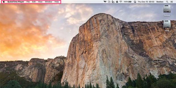 Đầu tiên bạn hãy mở QuickTime Player. Bạn sẽ không thấy xuất hiện cửa sổ ứng dụng nào trên màn hình cả, nhưng thanh menu của QuickTime đã xuất hiện ở bên trên.