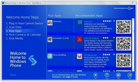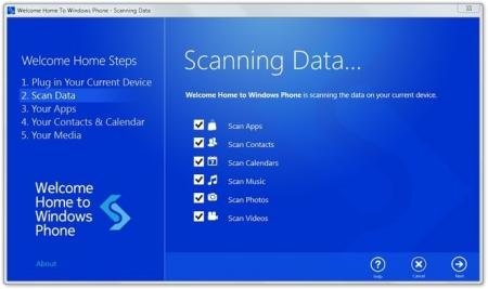 Tiếp theo, Welcome Home sẽ tự động quét các ứng dụng có trên smartphone ở bước Scan Data và đưa ra danh sách để người dùng tùy chọn mục nào sẽ được di chuyển lên Windows Phone. Nếu các ứng dụng có trên smartphone của bạn không có trên kho ứng dụng Marketplace của Windows Phone, Welcome Home sẽ tự động đưa ra những ứng dụng khác có tính năng tương tự để thay thế.