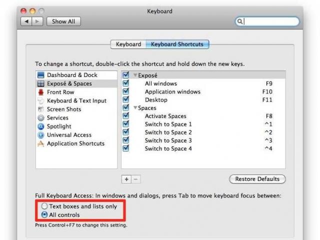 Để lựa chọn từng đối tượng trong môi trường làm việc như hộp thoại khi nhấn phím Tab, bạn chỉ cần vào System Preferences => Keyboard, và sau đó thiết lập 'Full Keyboard Access' thành ' All Controls.'