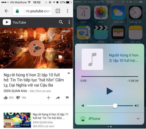 Lại thêm một tính năng khiến người dùng Táo mẻ phải tự hào về thiết bị của mình. Nếu đang nghe một đoạn nhạc Youtube trên Chrome hay Firefox mà muốn làm việc khác ngay trên iPhone của mình, bạn chỉ cần ẩn xuống và mở Trung tâm kiểm soát bằng cách vuốt từ phía dưới màn hình lên, và chọn nút Play..