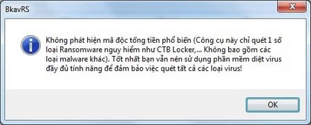 Trước thực trạng này, hãng phần mềm Bkav đã phát hành miễn phí công cụ chuyên dụng tìm và quét mã độc nguy hiểm này, phần mềm có tên BKAV Ransomware Scan - công cụ quét mã độc tống tiền.