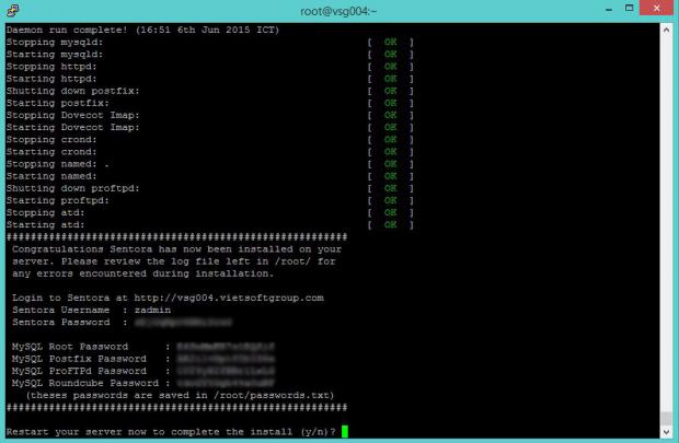 Đây chính là bước cuối cùng bạn đã cài đặt thành công trình quản lý Sentora trên máy chủ. Tại màn hình hiển thị hệ thống sẽ hiển thị toàn bộ dữ liệu bao gồm mật khẩu admin, mật khẩu MySql... Bạn hãy lưu toàn bộ thông tin vào một file txt nhé.