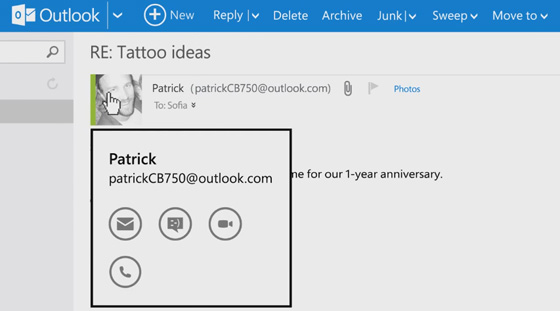Di chuột vào ảnh cá nhân trong Outlook thì một hộp thoại sẽ được bật lên bao gồm các chức năng như :'Gửi email, Trò chuyện, Chat Video và Gọi điện thoại trực tiếp qua dịch vụ của Skype'.
