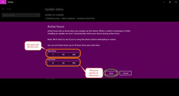 Để thực hiện, các bạn vào giao diện Windows Update trong mục Setting. Chọn Change Acitve Hours. Tùy chỉnh giá trị của Start Time (là thời gian bạn bắt đầu sử dụng máy tính) và End Time (cho đến thời gian bạn ngưng sử dụng). Chọn SAVE và khởi động lại máy tính để hệ điều hành lưu các thay đổi.