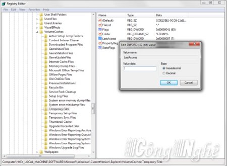 HKLM\SOFTWARE\Microsoft\Windows\CurrentVersion\Explorer\VolumeCaches\. Kích vào khóa Temporary Files. Ở khung Regedit bên phải bạn sẽ thấy giá trị DWORD tên LastAccess có giá trị bằng 7. Kích chuột phải vào LastAccess và chọn Modify từ thực đơn. Ở cửa sổ biên tập, thay đổi giá trị Value data thành giá trị theo ý muốn và nhấn OK. Tắt Regedit đi. Sau khi thay đổi, ứng dụng dọn dẹp disk cleanup sẽ xóa bất cứ file tạm thời nào đã tồn tại ít nhất một ngày.Bổ sung quyền “Take Ownership' vào thực đơn ngữ cảnh