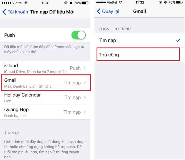 - Cài đặt > Email > Tài khoản > Tìm nạp dữ liệu mới > Chọn tài khoản email cần tắt (gmail, icloud) > Nhấn vào thủ công.