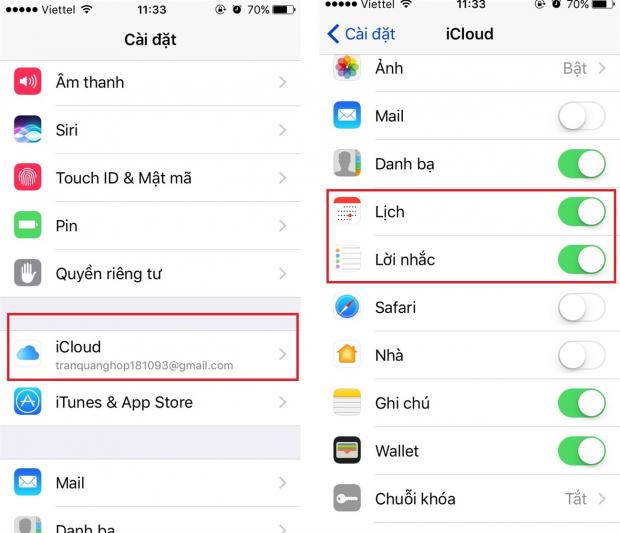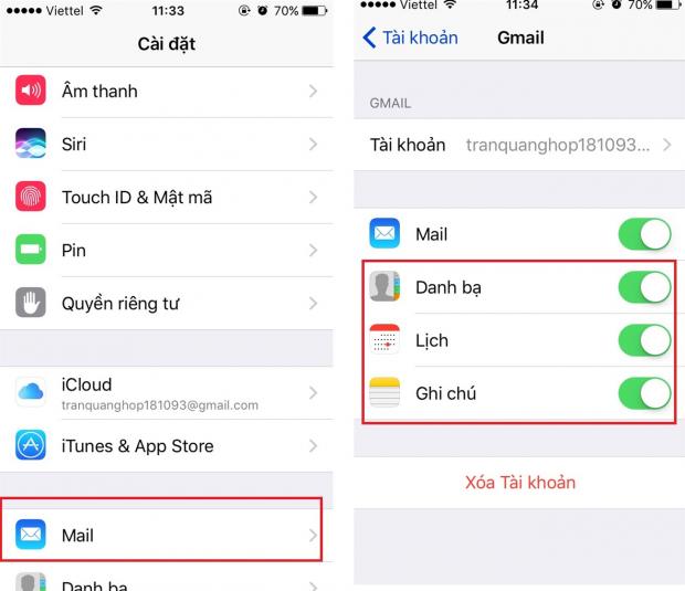 - Cài đặt > Email > Tài khoản > Chọn Email phụ (gmail, yahoo) > Sau đó bạn tắt các mục như: Danh bạ, lịch, ghi chú.
