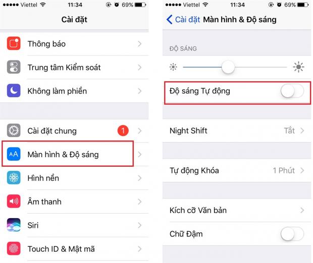 - Cài đặt > Màn hình và độ sáng > OFF 'Độ sáng tự động'.