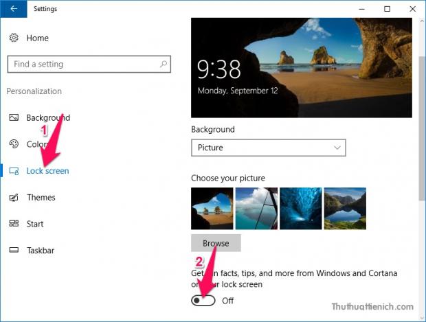 Trong cửa sổ bên trái, bạn chọn Lock screen, sau đó nhìn sang cửa sổ bên phải chọn Picture hoặc Slideshow trong phần Background . Tiếp tục nhìn xuống dưới, gạt công tắc trong phần Get fun facts, tips, and more from Windows and Cortana on your lock screen sang bên trái Off
