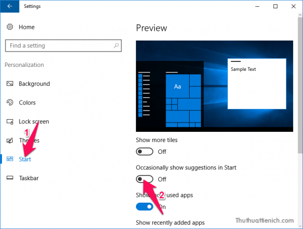 Trong cửa sổ bên trái, bạn chọn Start, sau đó nhìn sang cửa sổ bên phải gạt công tắc trong phần Occasionally show suggestions in Start sang bên trái (màu trắng – Off).