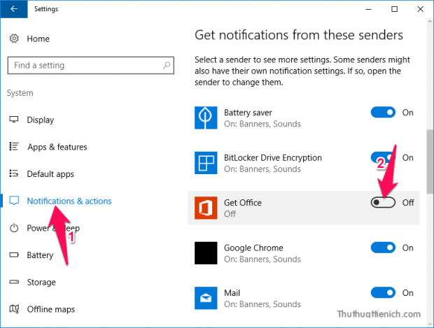 Chọn Notifications & Actions trong menu bên trái, sau đó nhìn sang bên phải gạt công tắc trong phần Get Office sang bên trái (màu trắng – Off).