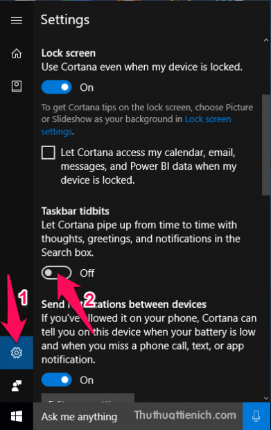 Nếu bạn cảm thấy điều này khó chịu có thể ngăn Cortana “nhảy đổng lên” bằng cách nhấn vào khung tìm kiếm của Cortana trên thanh taskbar, nhấn vào nút Settings ( trong khung bên trái, sau đó nhìn sang khung bên phải gạt công tắc trong phần Taskbar Tidbits sang bên trái (màu trắng – Off).