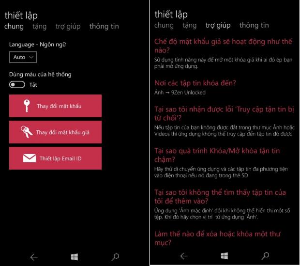 Trong phần thiết lập bạn có thể thiết lập mã PIN giả như mình đã nói ở bên trên và thiết lập Email ID phòng khi bạn quên mật khẩu. Nếu có điều gì còn thắc mắc phần trợ giúp sẽ hỗ trợ bạn những vấn đề thường gặp trong quá trình sử dụng.