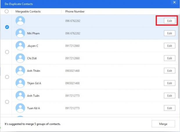 Bước 5: Sau khi nhấn vào Retry thì danh sách các liên lạc trùng trên iPhone của bạn sẽ hiển thị ra, lúc này bạn chọn vào số điện thoại trùng muốn xóa và nhấn vào Edit để xóa.