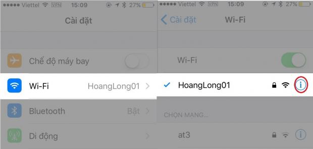 Để thiết lập chặn quảng cáo bạn cần vào Cài đặt > Wi-Fi. Sau đó nhấn vào Chi tiết Wi-Fi.
