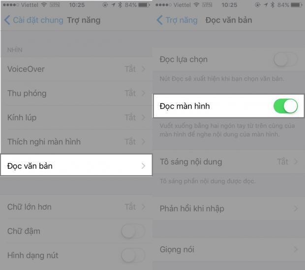 Để mở tính năng này, bạn vào Cài đặt > Cài đặt chung > Trợ năng > Chọn Đọc văn bản. Sau đó hãy kích hoạt bật Đọc màn hình.
