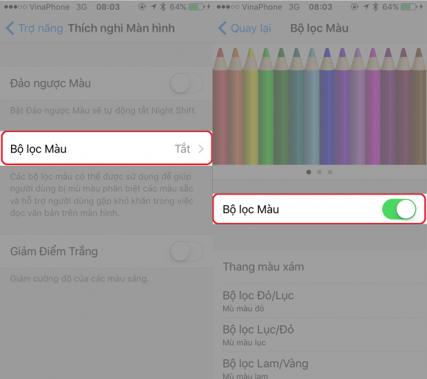 Trong mục Trợ năng > tìm đến chọn tính năng Thích nghi màn hình > Bộ lọc màu.