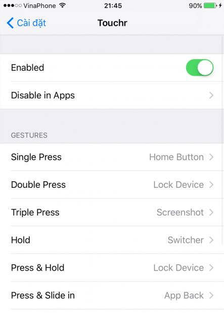 5. Touchr (nguồn: rpetri.ch repo Thay thế cho Virtual Home, tùy biến Touch ID thêm nhiều tác vụ hơn.