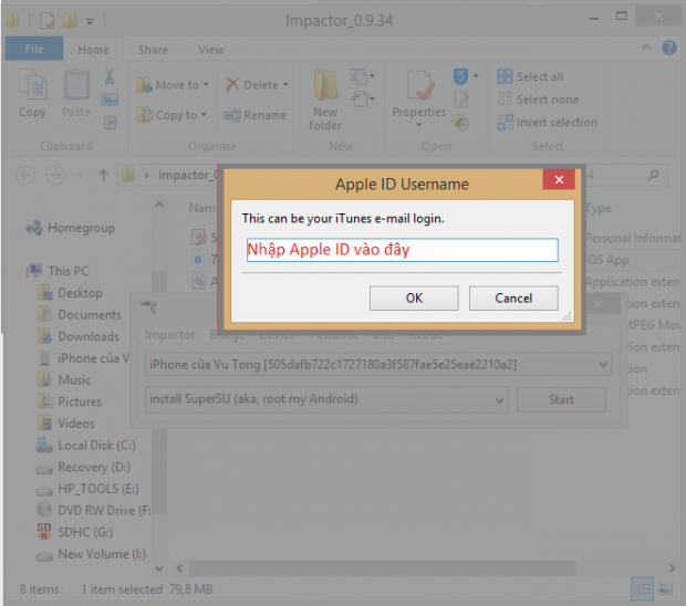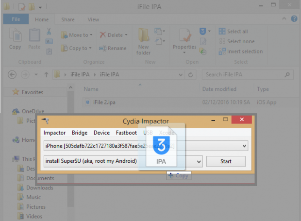 Sau khi iPhone đã kết nối thành công, hãy kéo tập tin .ipa vừa tải về vào giao diện của Cydia Impactor.